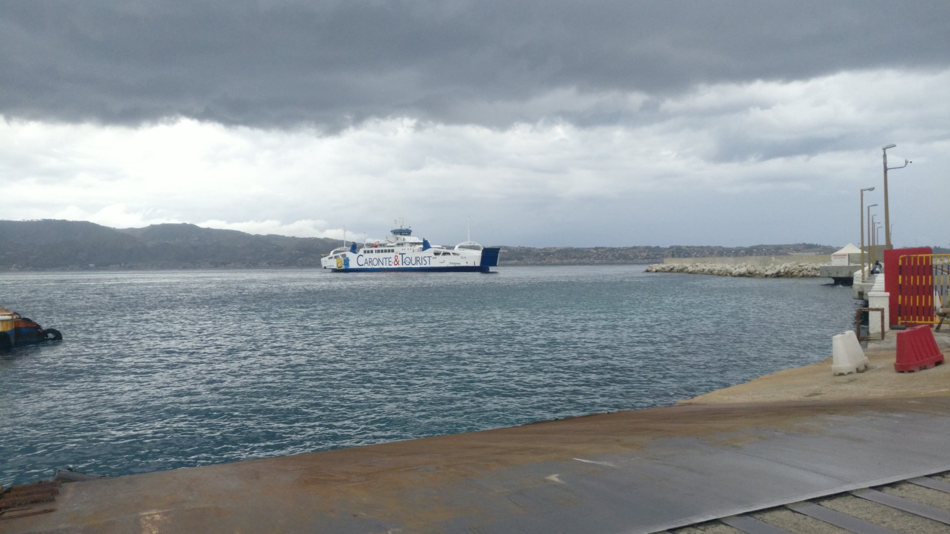 In het zuiden van Italië aangekomen, bij Villa San Giovanni maken we een lunchstop en zien we Sicilië aan de andere kant van het water liggen.